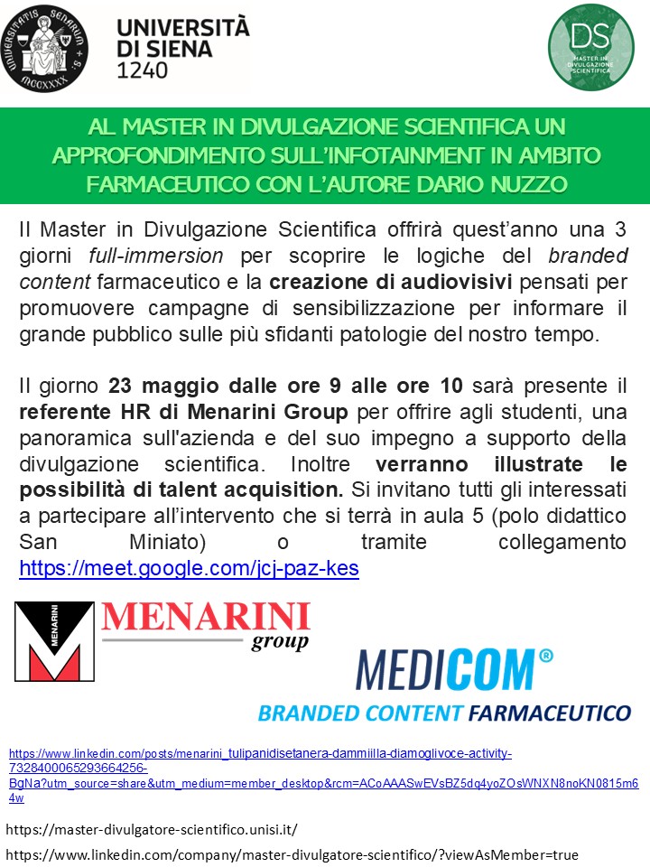 AL MASTER DI DIVULGAZIONE SCIENTIFICA DI SIENA, UN APPROFONDIMENTO SULL’INFOTAINMENT IN AMBITO FARMACEUTICO CON L’AUTORE DARIO NUZZO